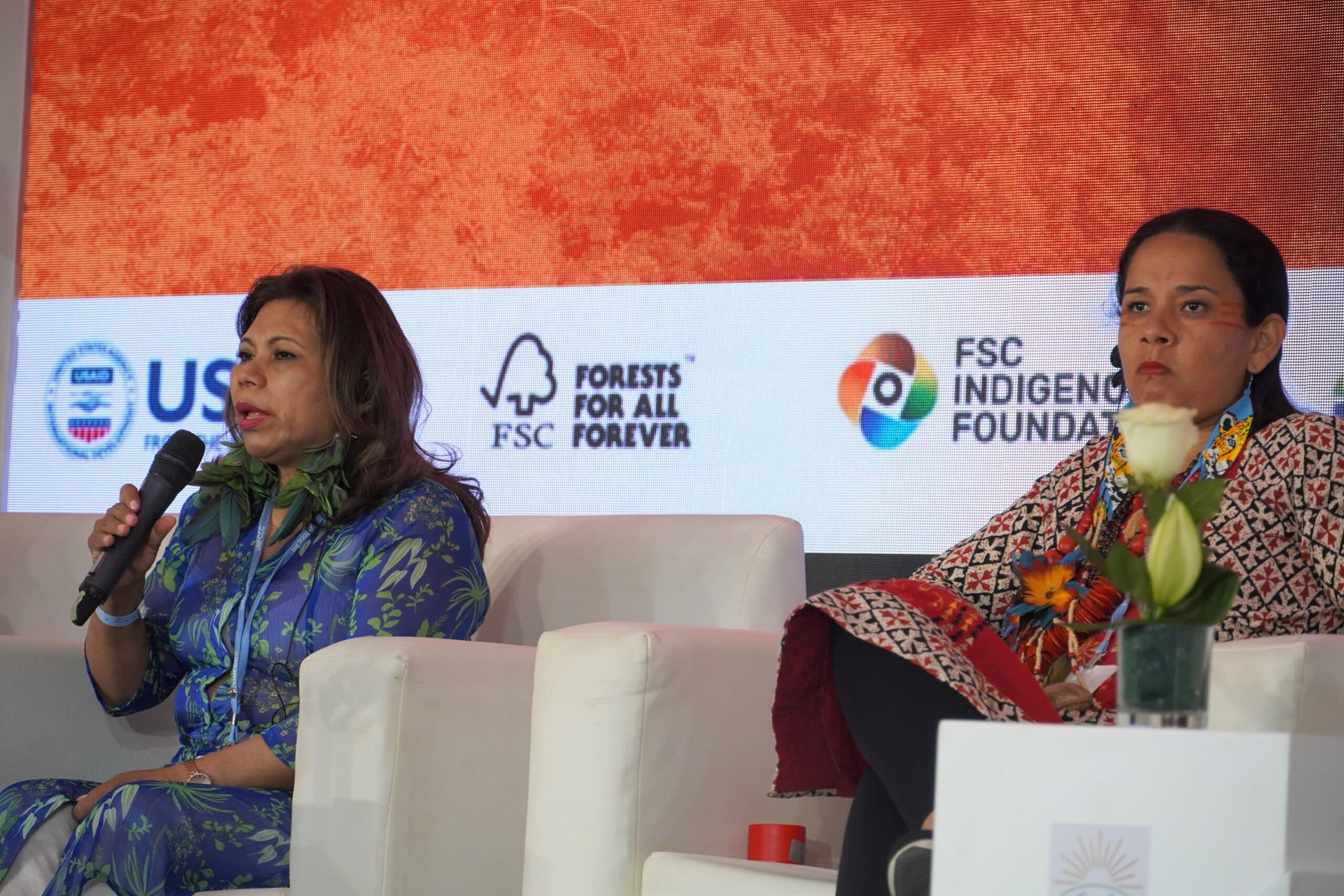 Diana Mori, representative of the Shipibo-Conibo Indigenous group, spoke about Indigenous women’s participation in the struggle for collective rights and communal forests and how communities have adapted their traditional knowledge of forest management with proposals and voluntary standards for FSC certification. Indigenous Peoples need to understand climate finance and how certification mechanisms work.