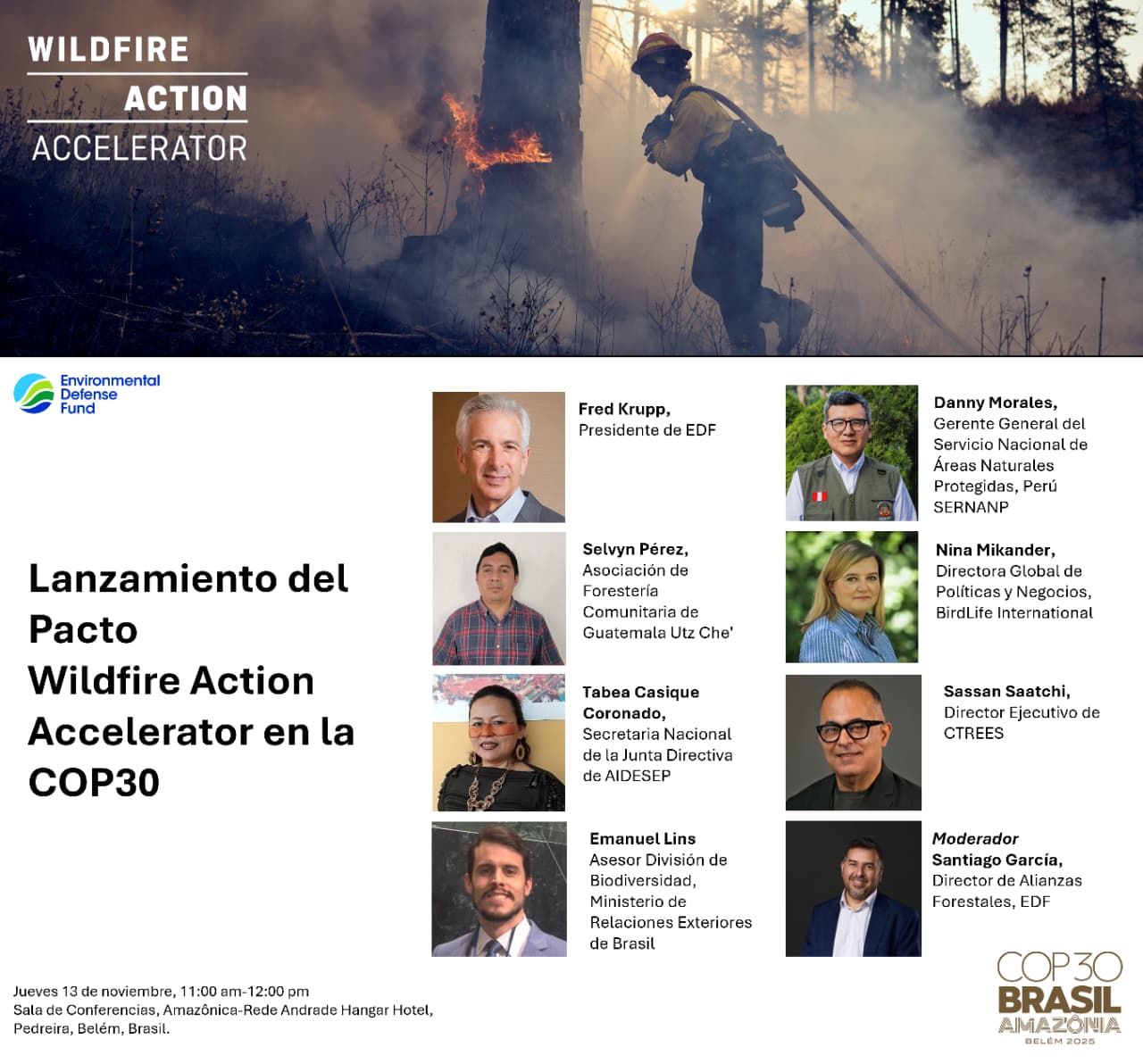 Durante la COP30, nuestra delegación asistirá al lanzamiento oficial del Wildfire Action Accelerator Pledge, organizado por el Environmental Defense Fund (EDF) bajo el liderazgo de Mónica Vidal.