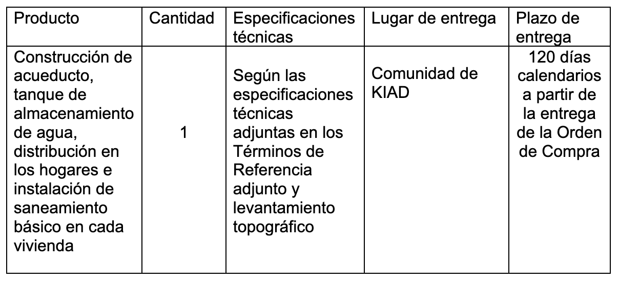 - Contrato: SUMINISTRO DE MATERIALES Y MANO DE OBRA PARA LA CONSTRUCCIÓN, INSTALACIÓN Y PUESTA EN MARCHA DEL ACUEDUCTO RURAL Y DE 25 MÓDULOS SANITARIOS PARA LA COMUNIDAD DE KIAD.