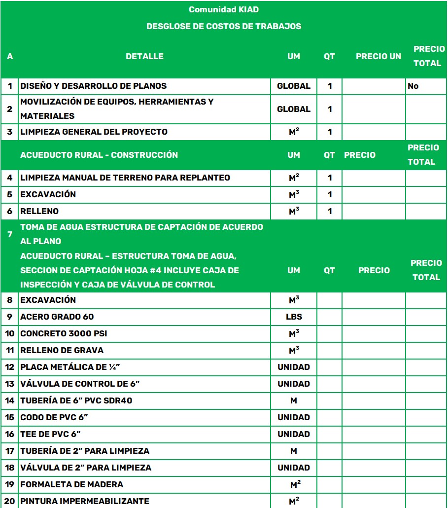 - El Contratista instalará toda la estructura de captación o toma de agua, líneas de tuberías, válvulas, tanque de almacenamiento, cámaras reguladoras de presión, interconexión para las 25 viviendas beneficiadas en la comunidad de Kiad.
