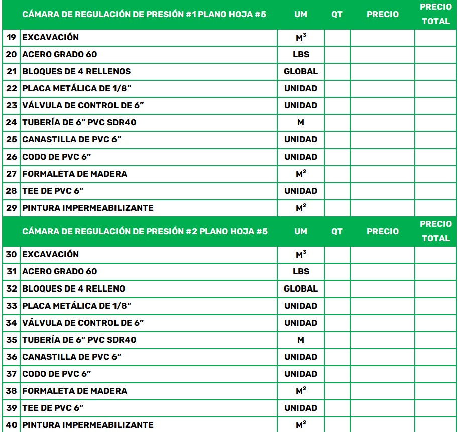 - Las cámaras reguladoras de presión deben ser de bloques de 4 rellenos. Acero de refuerzo grado 60.