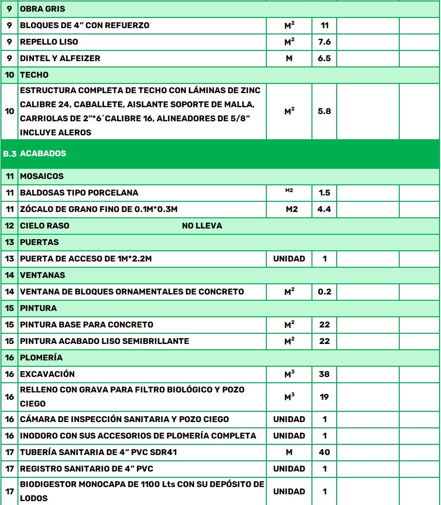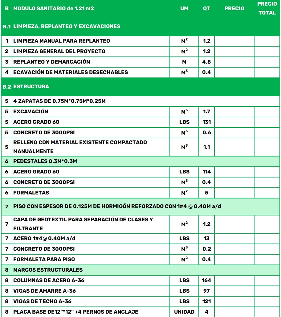 - El Contratista deberá suministrar los materiales y construir los 25 módulos sanitarios de acuerdo al desglose mostrado en el punto 4.