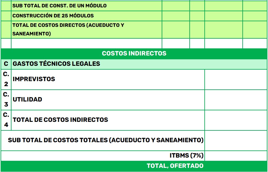 Propuesta Técnica: – Certificaciones que acrediten al menos de tres a cinco años de experiencia en construcción con participación en al menos dos (2) proyectos de igual o mayor valor a USD 20,000. – Se valorará experiencia previa en zonas de acceso remoto. – Cronograma de trabajo con tiempos estimados para adquisiciones, transporte y ejecución. – Plan de trabajo: logística, personal, estrategias, recursos propios y subcontratados, adquisición y transporte de materiales. Paz y salvo DGI. El Contratista que resulte con la mejor propuesta deberá presentar fianza de cumplimiento y de responsabilidad social.